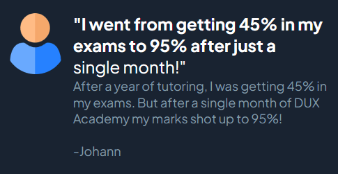 Implement the DUX Academy blueprint and go from getting D’s and C’s to becoming an academic weapon and ranking top 5 in your school (guaranteeing your dream ATAR) in just 6 weeks.